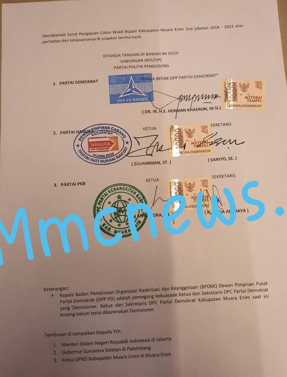 Drs. Ramlan Holdan selaku ketua DPW PKB Sumsel melalui via telpon menyampaikan ” terkait telah disepakatinya 3 partai pengusung DPC PKB, DPP PD BPOKK Demokrat, DPC Hanura, sudah menyerah surat rekomendasi untuk pemilihan wakil bupati kepada PJ bupati Muara Enim, dan diterima oleh PJ.Sekda yang memang dalam hal ini merupakan tugas dari PJ bupati untuk memfasilitasi pemilihan wakil bupati sesuai amanat Pasal 176 Undang-undang nomer 10 Tahun 2016″.