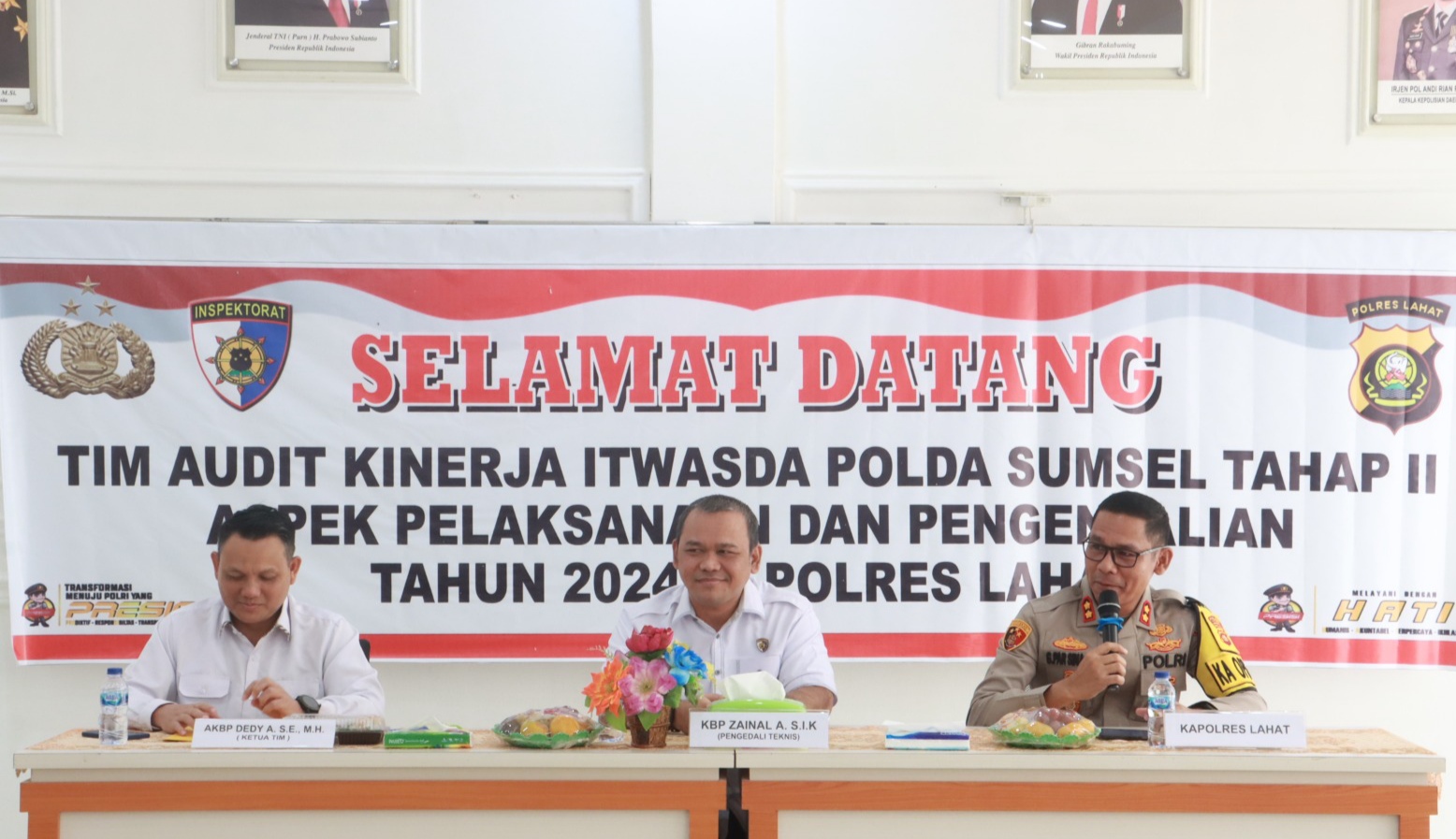 Dalam rangka Tim Audit tahap II Itwasda Polda Sumsel kunjungan ke Polres Lahat yang langsung di sambut oleh Kapolres Lahat, AKBP G. Parlasro Sinaga, SH, SIK, MH, beserta PJU polres lahat, sebagai giat pelaksanaan dan pengendalian di Polres Lahat