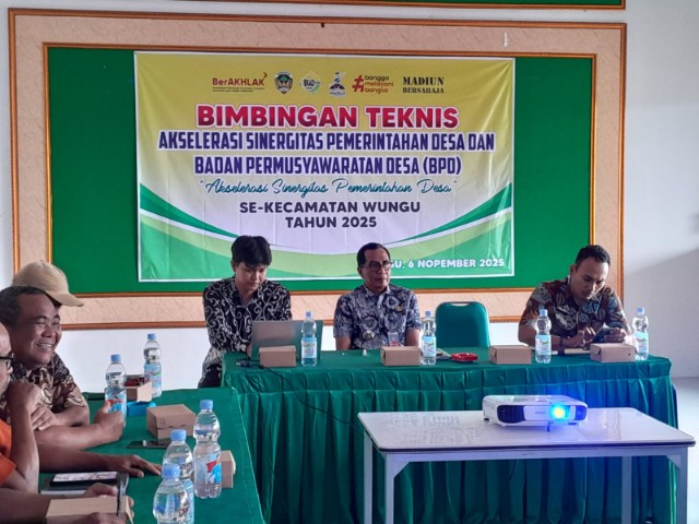 Madiun | MMC – Pemerintah Kecamatan Wungu menggelar bimbingan teknis (bimtek) untuk meningkatkan akselerasi sinergitas antara pemerintah Desa dengan BPD. Bertempat di kantor Desa Mojopurno, bimtek tersebut Camat Wungu Basudewo beserta jajaran, Kepala Desa dan Ketua BPD se-Kecamatan Wungu, Kamis (06/10/2025).