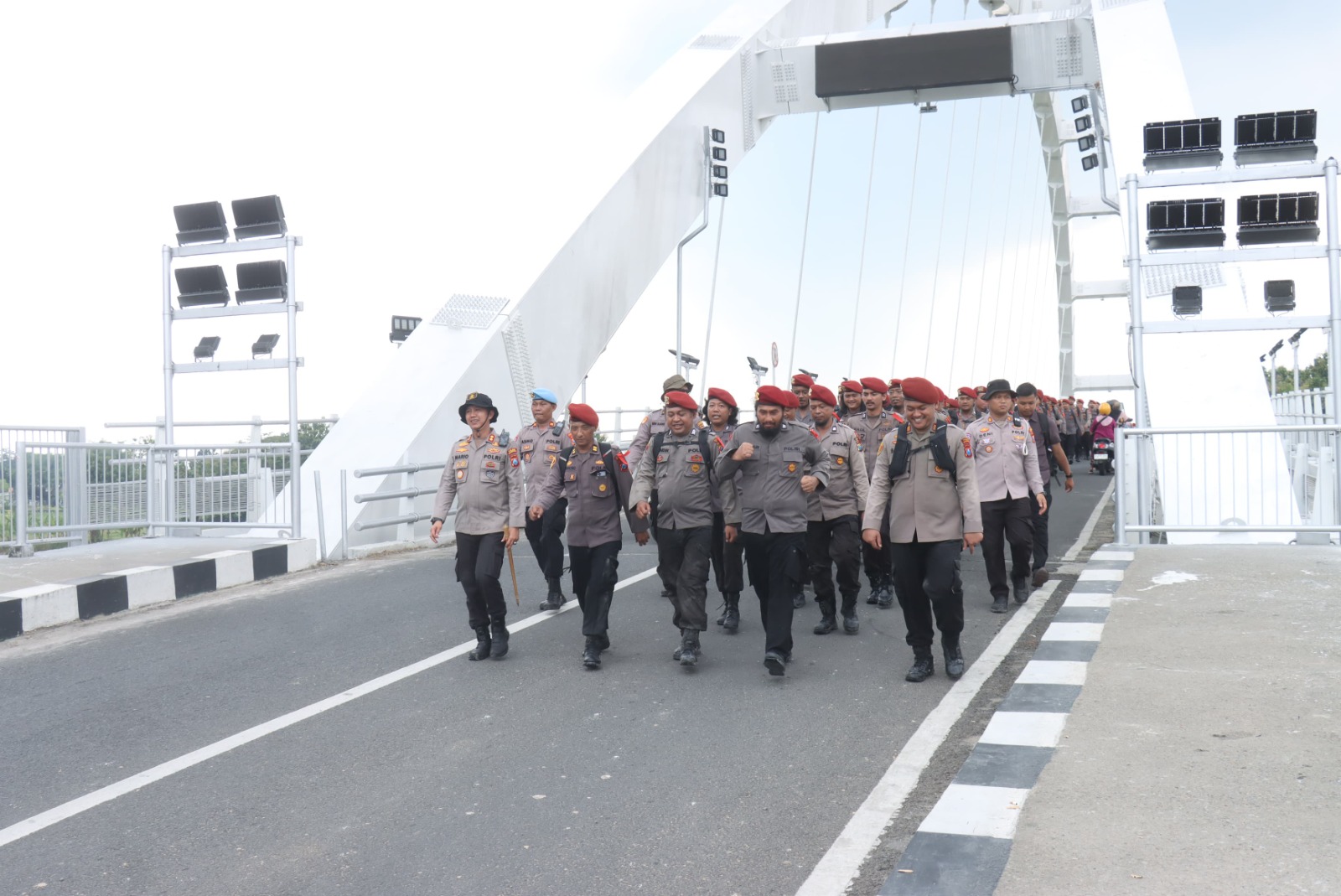 Long march menjadi tantangan utama dalam kegiatan ini. Para personel dengan penuh semangat menempuh perjalanan darat yang menguras fisik, namun tetap menjaga kekompakan dan kedisiplinan. Tidak hanya peserta pembaretan, Kapolres Bojonegoro pun turut berjalan kaki bersama personel hingga kembali ke Mapolres, sebagai bentuk dukungan moral dan motivasi.