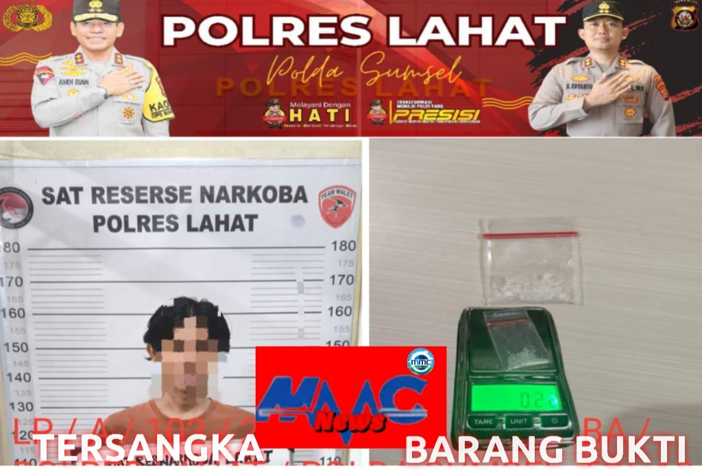 Jajaran Polres Lahat melalui Polsek Kota Lahat yang dipimpin oleh Kanit Reskrim Polsek Kota DODI PERMANA, S.H. beserta anggota Unit Reskrim telah berhasil ungkap kasus Tindak Pidana Narkoba dan meringkus Tersangka Pelaku (TP) seorang laki- laki berinisial:ROBIN (25 tahun) warga yang berlamat di kelurahan Pasar Bawah Jl. Gotong Royong Dusun I Rt. 001 Rw. 003 Kec. Lahat Kab. Lahat.