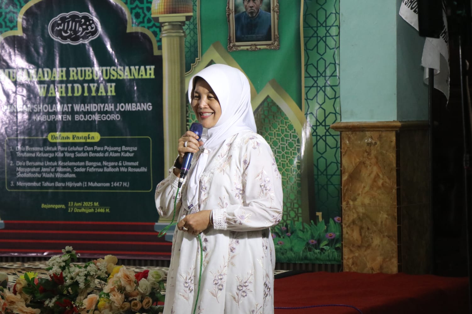Bojonegoro – Bupati Bojonegoro, Nurul Azizah, didampingi Kepala Dinas Kesehatan, Ninik Susmiati, menghadiri acara Mujahadah Rubu’ussanah Wahidiyah Penyiar Sholawat Wahidiyah Jombang Kabupaten Bojonegoro yang bertempat di Balai Desa Kalirejo, Kecamatan Bojonegoro. Acara yang bertajuk “Doa Bersama” ini dihadiri oleh ratusan jemaah dan bertujuan mulia: mendoakan para leluhur dan pejuang, memohon keselamatan dan kesejahteraan bangsa Indonesia, kelancaran dan kemabruran jemaah haji, serta kesadaran umat akan ajaran Fafirru Ilalloh Warosulihi SAW.