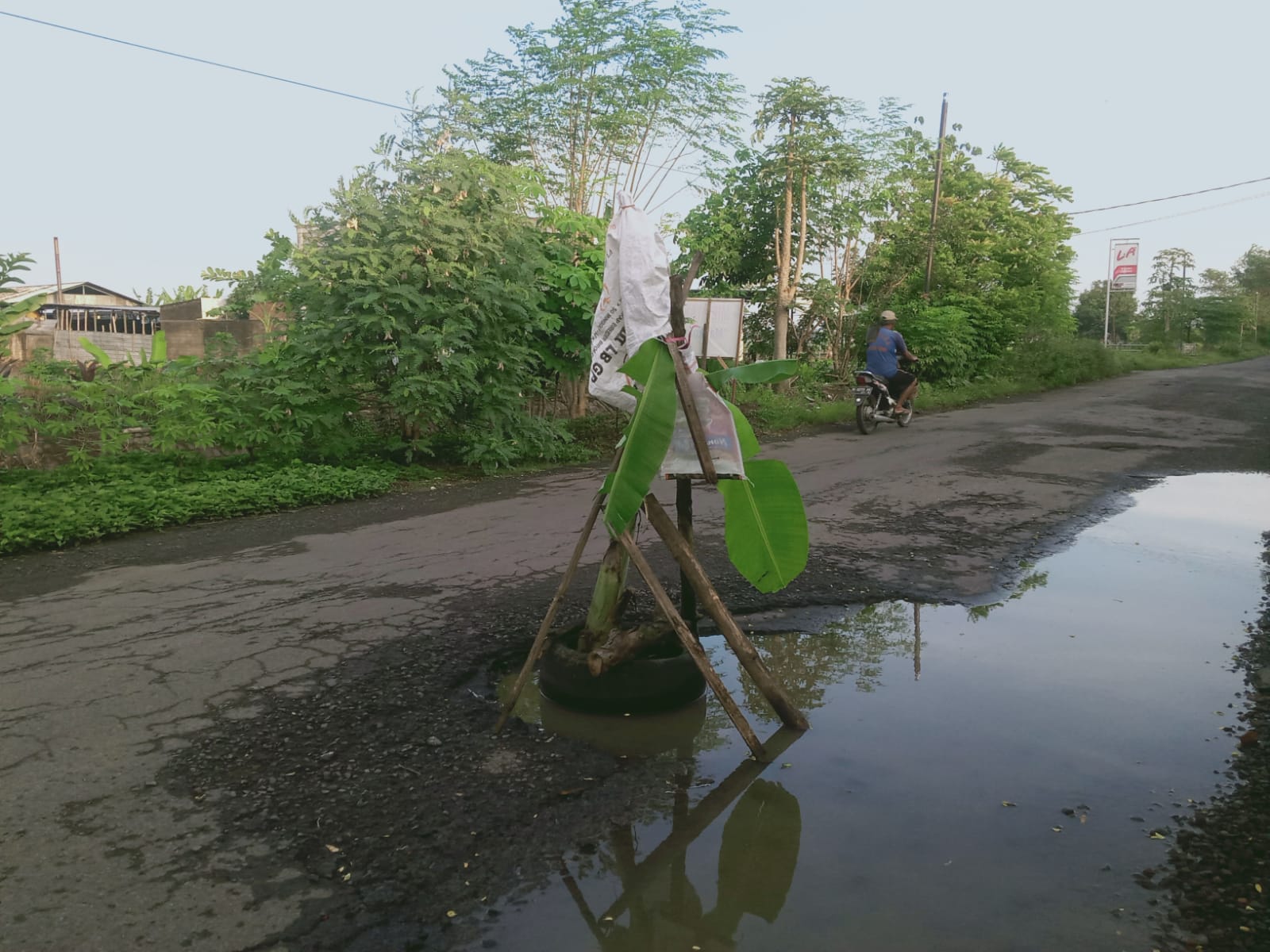 Bukan hanya itu saja, di bagian atas daun juga di berikan karung warna putih di ujung daunnya, selain sebgai bentuk kekesalan juga sebagai rambu agar waktu malam bisa terlihat bagi pengendara yang melintas. Hal itu di lakukan warga karena seringnya terjadi pengendara yang jatuh terpelosok di sebabkan banyaknya jalan berlubang di jalan tersebut.