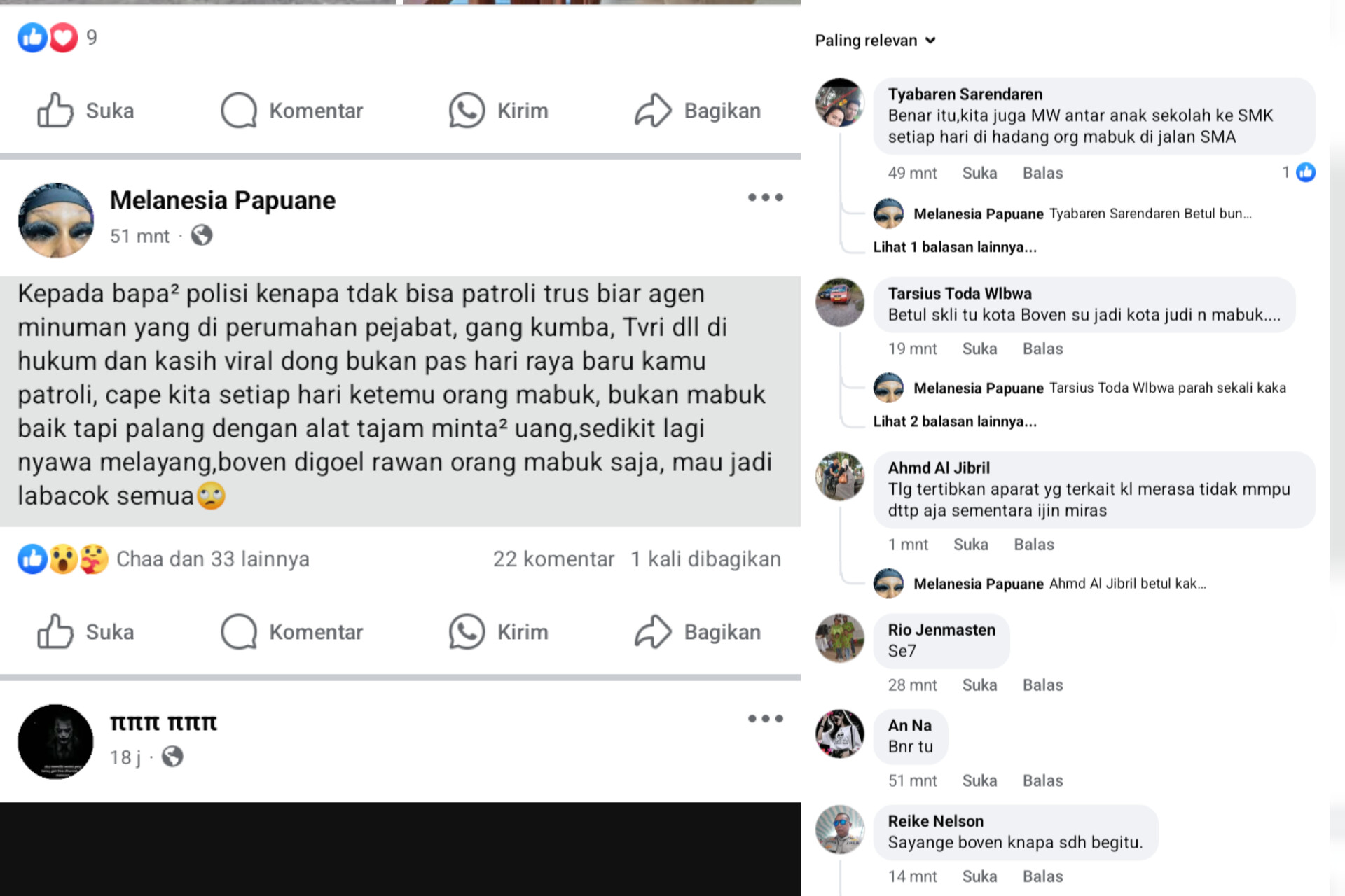 Boven Digoel, Mmcnews – Warga Kota Tanah Merah di Kabupaten Boven Digoel, kembali meluapkan keluhan terkait aktivitas orang yang dipengaruhi minuman keras (miras). Keluhan tersebut disampaikan dalam sebuah postingan di grup Facebook “Info Kejadian Boven Digoel” yang diunggah oleh seorang warga berinisial Melanesia Papua. Dalam postingannya, ia meminta pihak keamanan, khususnya kepolisian, untuk segera menertibkan penjualan miras yang marak di pusat kota serta menangani orang-orang yang terpengaruh miras yang sering melakukan aksi pemalakan dengan menggunakan senjata tajam.
