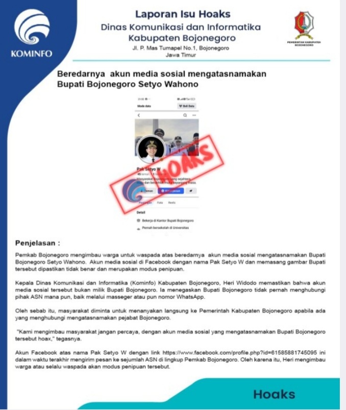 “Kami mengimbau masyarakat jangan percaya, dengan akun media sosial yang mengatasnamakan Bupati Bojonegoro tersebut hoax,” tegasnya.