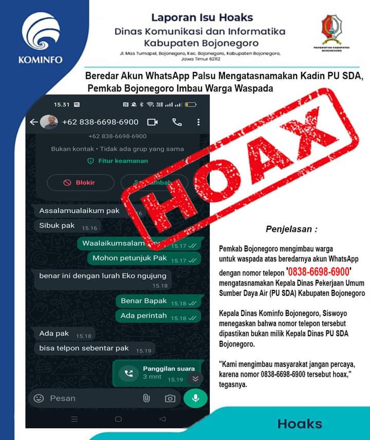 Bojonegoro- Pemkab Bojonegoro mengimbau warga untuk waspada atas beredarnya akun WhatsApp yang mengatasnamakan Kepala Dinas Pekerjaan Umum Sumber Daya Air (PU SDA) Kabupaten Bojonegoro. Akun WhatsApp dengan nomer 0838-6698-6900 tersebut bermodus penipuan dan dipastikan tidak benar.