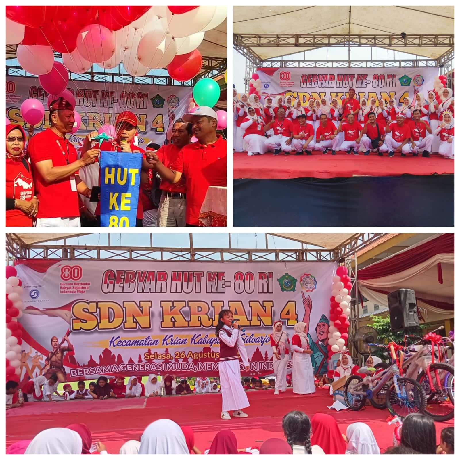 Kegiatan dibuka secara resmi oleh Kepala Dinas Pendidikan dan Kebudayaan Kabupaten Sidoarjo, Dr. Tirto Adi, M.Pd., didampingi Plt. Kepala SDN Krian 4, Junaidi, S.Pd., M.Pd. Keduanya turut serta melepas balon ke udara sebagai tanda dimulainya rangkaian acara.